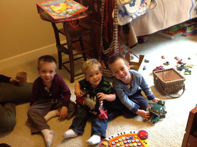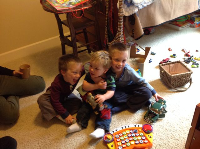 Brotherly love, until middle one asserts himself. Youngest one cries out injustice! Parental hand steps in to teach sharing, The older one does not want to get involved.